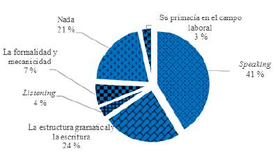 En la pregunta relacionada con aquellos aspectos que les resultan desagradables del inglés, aunque el 21 % reconoce que no le desagrada nada, la mayoría señala que los aspectos que más les disgustan están relacionados con el habla y las formas gramaticales, que son además los que fundamentan el aprendizaje de esta lengua (véase la figura 1). Algunos estudiantes llegan incluso a catalogar como caprichosa la gramática inglesa, debido a que les resulta difícil aplicar una lógica para comprender estas reglas.