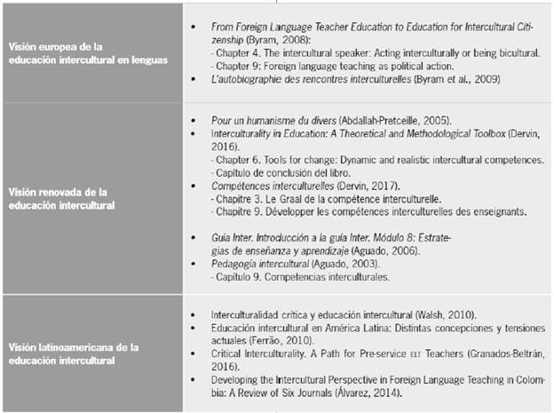 Rápidamente, la educación intercultural tuvo eco en diferentes disciplinas educativas. En el campo de la didáctica de las lenguas extranjeras, el concepto de interculturalidad comenzó a emplearse después del surgimiento de los enfoques comunicativos (Barthélémy, 2016; Puren, 2002). Sin embargo, solo a partir de los años noventa el término se instaló definitivamente en el campo, gracias a trabajos como los de Byram (1997), quien acuñó el término competencia comunicativa interculturaly presentó su famoso modelo de los cinco saberes (savoir, savoirêtre, savoir-apprendre/faire, savoir comprendre et savoir s'engager). En el medio francófono, trabajos como los de Porcher (1986), Abdallah-Pretceille (1996) y Zarate (1993) contribuyeron al arraigo del término en esta disciplina. Más tarde, el Marco Común Europeo de Referencia para las Lenguas (Conseil de l'Europe, 2001) propuso el concepto de consciência intercultural, que se logra gracias "al conocimiento, la percepción y la comprensión de la relación entre el 'mundo de origen' y el 'mundo de la comunidad objeto de estudio' (similitudes y diferencias distintivas)" (p. 101). Según los autores del Marco, esta noción incluye la conciencia sobre la diversidad regional y social característica de ambos mundos. Aun así, solo después de la publicación del volumen complementario (Conseil de l'Europe, 2018) del mismo documento se le asignó un lugar importante a todo lo relacionado con la interculturalidad, la mediación y la competencia plurilingüe. Dicho sea de paso, la perspectiva de interculturalidad difiere en muchos de estos trabajos o ha evolucionado con el tiempo. De hecho, en muchos de ellos se observa un deseo de acercarse a las culturas de la(s) lengua(s) extranjera(s) objeto de estudio y desarrollar competencias para entrar en contacto con sus hablantes. No obstante, algunos trabajos apuntalan la importancia de adoptar una visión amplia de interculturalidad en la clase de lenguas, refiriéndose a las diversas variedades de alteridad, tal como lo explican Blanchet y Coste (2010): "la interculturalidad recubre las modalidades y los efectos concretos de los encuentros interindividuales de y en la alteridad, alteridad irreductible en su totalidad debido a la pluralidad infinita de los fenómenos humanos y sociales" (p. 11, traducción propia).