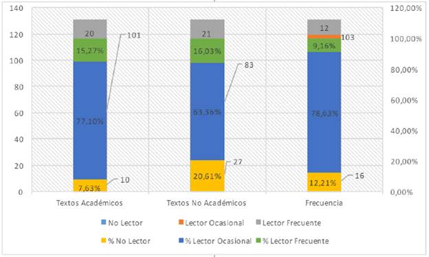 Siguiendo con el presente estudio, en relación con la frecuencia de lectura en inglés, se observa en la gráfica 2 que un 7,6 % se considera como no lector de textos académicos ya que nunca o casi nunca leen este tipo de textos en inglés en su tiempo libre. El 77,10 % clasifica como lector ocasional de textos académicos, es decir, que leen estos textos en inglés alguna vez al mes o alguna vez cada tres meses. Solo un 15,27 % de los estudiantes clasifica como lector frecuente de textos académicos, esto es, que lee este tipo de textos semanalmente o a diario. La tendencia es similar cuando se trata de los textos no académicos, ya que el 20,61 % son no lectores y solo el 16,03 % de los estudiantes son lectores frecuentes de textos no académicos en blogs, páginas web, revistas de entretenimiento, cómics, material literario, entre otros. La mayoría de los estudiantes encuestados son lectores ocasionales de textos no académicos.