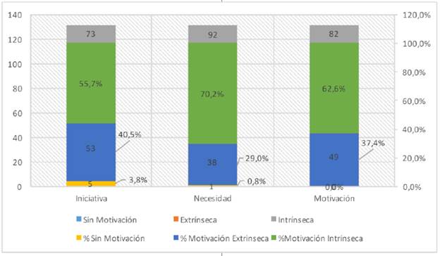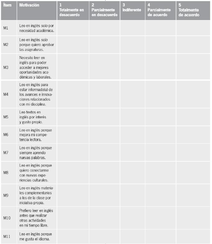 En cuanto a la motivación, un alto porcentaje de estudiantes que leen presenta una motivación extrínseca para leer en inglés (40,5 %), es decir, no leen por iniciativa y gusto propios, sino motivados por el carácter de obligatoriedad de la lectura en inglés en la carrera. Dicho resultado permite observar que una buena parte de los estudiantes de semestres avanzados en el programa de Licenciatura en Bilingüismo no leen materiales en inglés dite-rentes a los que se exigen en la carrera, y un 3,8 % manifiesta no tener motivación para leer en inglés.