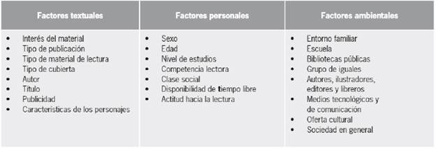 La formación del hábito lector se ve influenciada por varios factores de tipo textual, personal y ambiental, tal como lo evidenció el Ministerio de. Educación, Cultura y Deporte en España (2001) al realizar un estudio sobre el hábito de lectura de los adolescentes (véase la tabla 1).