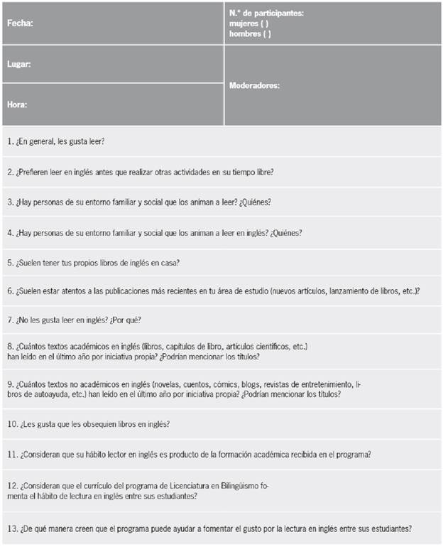 Luego, se usó la técnica de grupo focal para dialogar con los estudiantes, a partir de un conjunto de preguntas problematizadoras, para conocer sus apreciaciones acerca de su propio hábito lector en inglés, así como de los factores que ellos consideran influyentes en su actividad lectora. Se realizó un primer grupo focal en la jornada nocturna con estudiantes de IV A VIII semestre, y un segundo grupo en la jornada diurna. En cada grupo focal participaron 13 estudiantes de manera voluntaria y fueron moderados por dos integrantes del equipo de investigación. El número de estudiantes en cada grupo focal se determinó siguiendo la literatura consultada, según la cual se establece, dependiendo del tema y objetivo de la investigación, un rango entre seis y doce participantes para que esta técnica cualitativa sea viable.