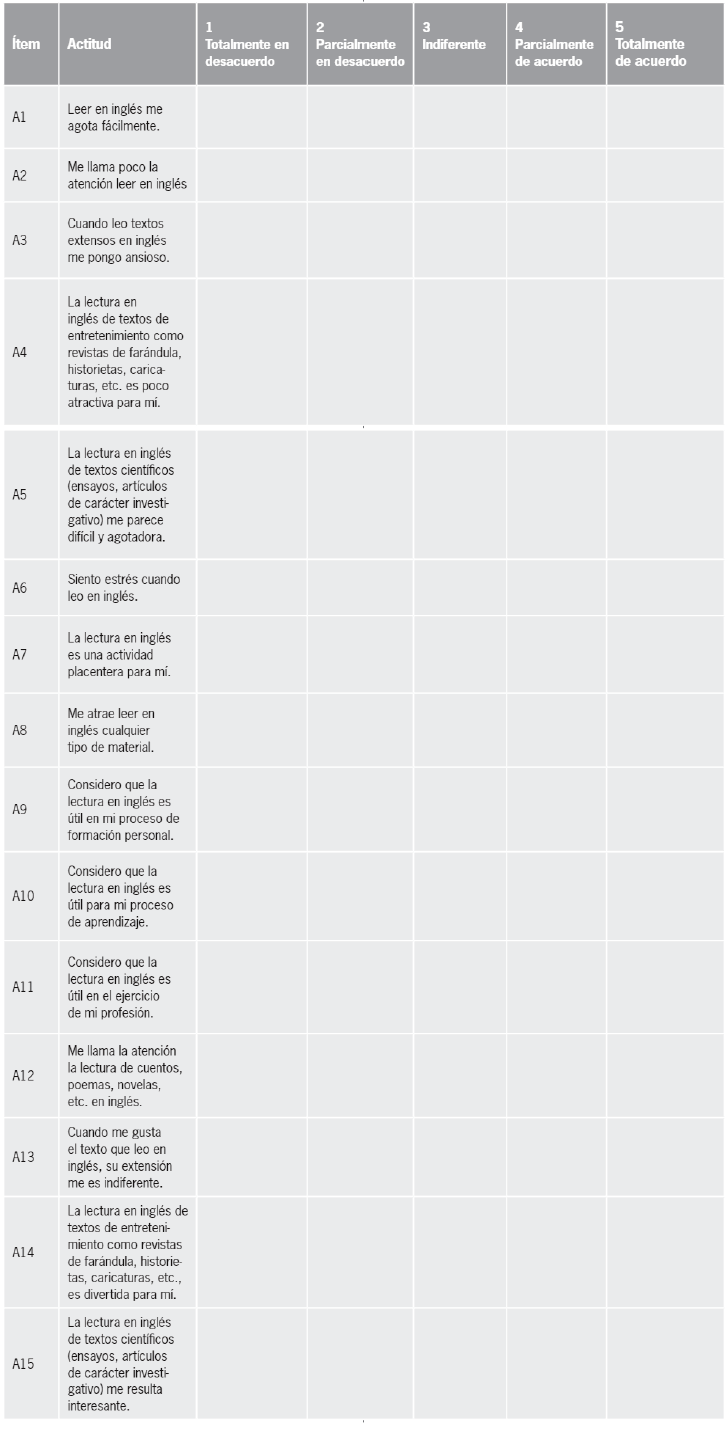 Al medir las actitudes hacia la lectura en inglés se obtuvo que la mayoría de ellos (90,8 %) respondió positivamente a las preguntas relacionadas con la utilidad de la lectura en inglés; es decir, los estudiantes consideran que la lectura en inglés es útil en el proceso de aprendizaje, en la formación personal y en el ejercicio de su profesión. No obstante, al indagar específicamente por el gusto, la mayoría (54,2 %) mostró una actitud negativa, es decir, que para ellos la lectura en inglés no representa una actividad placentera o no les atrae leer en inglés cualquier tipo de material.