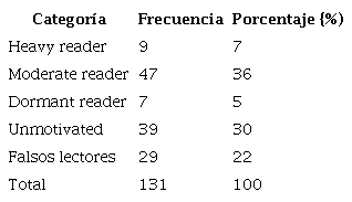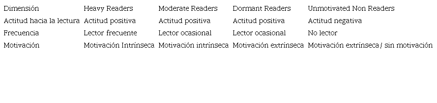 Unmotivated non readers: estudiantes con una actitud negativa frente a la lectura en inglés, nunca leen y, si lo hacen ocasionalmente, es por una motivación extrínseca, es decir, nunca por iniciativa o gusto propios.