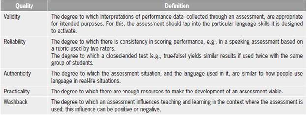 To further contribute to an assessment's usefulness, teachers designing or using assessment instruments should consider their theoretical qualities. Table 1 is a synthesis of five central qualities of assessments (Bachman & Palmer, 2010; Giraldo, 2019; Green, 2014):