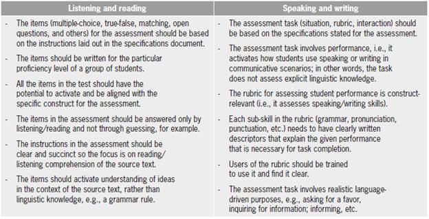 For quality control, assessment designers should plan their products by writing a document with specifications (Davidson & Lynch, 2001; Fulcher, 2010). This document includes the purpose, the specific skills, the assessment method, number of items or tasks and their nature, as well as any other information that can help to ensure the assessment is planned and designed to meet its purpose. Among these specifications, one needs to be underscored: the specific skills to be assessed need to be clearly delineated; this is commonly called construct definition (Carr, 2011; Fulcher, 2010). Lack of clarity in this regard may lead to an assessment that is not useful. In Table 2, we synthesize major specific guidelines for listening/reading and speaking/writing assessments.
