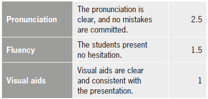 Two (out of eight) speaking assessments included a rubric. However, upon analysis, we noticed that this instrument did not represent crucial areas of speaking. For instance, the sample below is focused on pronunciation, fluency, and visual aid. However, grammar, vocabulary, coherence or other aspects are not present in this rubric; additionally, visual aids are assessed, which are not part of a learner's speaking skills.