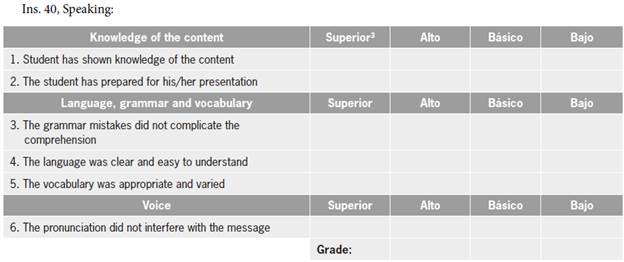 We found two major issues with the instruments to assess these skills. On the one hand, the rubrics that the teachers used did not fully state what about these skills was to be assessed; a related problem was the lack of rubrics to assess these skills. According to the rubric in Table 5 below, the teacher was meant to assess knowledge of the content, language grammar and vocabulary, and voice. However, these aspects are not clearly defined, which is a key condition for validity in assessment: it is not clear what specific aspects of grammar or vocabulary are assessed.