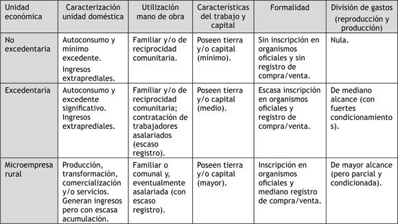 unidades económicas de carácter doméstico o comunitario que realizan actividades de producción, transformación, comercialización y/o servicios (pudiendo realizar una o más de ellas). Generan ingresos pero tienen escaso nivel de acumulación. Utilizan mano de obra familiar o comunal y, eventualmente, asalariada (con un muy escaso porcentaje de registración). Poseen capital y pueden ser propietarios de la tierra o arrendar, o bien una combinación de ambas con el fin de ampliar las posibilidades productivas. No existe una división de funciones entre el propietario, asociados y los trabajadores. Los registros de sus operaciones pueden ser irregulares e incompletos y sin facturación pero suelen formar parte de registros oficiales de algún tipo. La producción suele estar destinada al mercado local y regional y propender a la expansión a nivel nacional18. Un ejemplo de estas microempresas rurales lo constituyen los diversos grupos que se generan con fines de comercialización; pueden tomar formas jurídicas (como cooperativas o asociaciones) o ser uniones de hecho; si bien su finalidad está ligada a la comercialización, muchas veces cumplen otros roles, como préstamos y capacitaciones. Las tareas administrativas pueden dividirse o intercambiarse; en tanto que todos los miembros participan de las actividades de producción (ganadera, agrícola, de manufacturas, etc.). Los ingresos que se generan son repartidos según cada caso particular (González, 2014).