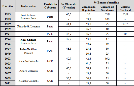 El siguiente cuadro presenta a los gobernadores de Corrientes a lo largo del período de estudio, junto con el porcentaje de sufragios que lograron para acceder al Poder Ejecutivo provincial. Al mismo tiempo, se muestra el porcentaje de bancas que obtuvieron las fuerzas oficialistas en las Cámaras Legislativas y en el Colegio Electoral.