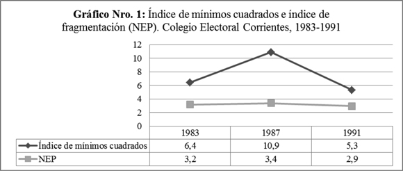 En el Gráfico Nro. 1 puede apreciarse la relación entre el índice de fragmentación partidaria (NEP) y el índice de mínimos cuadrados (desproporcionalidad) que generaba el sistema de electores para la designación del gobernador provincial. A medida que la fragmentación aumentaba, el sistema se volvía menos proporcional y favorecía a la fuerza electoralmente más fuerte, el Pacto. Cuando la fragmentación descendía, el reparto era más proporcional y disminuía el beneficio para el partido más votado.