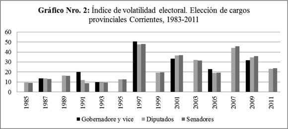 El Gráfico Nro. 2 presenta el índice de volatilidad electoral, que mide el porcentaje de votos que cambia entre las distintas fuerzas políticas en dos comicios consecutivos. El rango oscila entre 0 (cero) y 100 (cien), y corresponde al porcentaje de votos que cambia entre las distintas fuerzas políticas en dos comicios consecutivos. Puede afirmarse que hasta 1995 el sistema de partidos mostraba rasgos de institucionalización, en la medida en que los niveles de volatilidad eran relativamente bajos en comparación con el período subsiguiente.