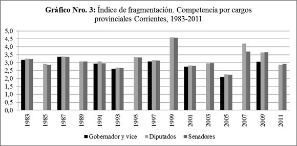 El Gráfico Nro. 3 ilustra el índice de fragmentación para las tres categorías provinciales. En este trabajo se mide el NEP a partir de los sufragios (número efectivo de partidos electorales), pero también es posible medirlo conforme a los escaños (número efectivo de partidos parlamentarios). La renovación parcial de las Cámaras cada dos años y la representación proporcional dificultan la formación de mayorías parlamentarias. A ello hay que añadir que el NEP se ubicó en torno a los tres partidos efectivos en muchas de las elecciones observadas en el estudio, generando un escenario multipartidista. Además, las disputas intrapartidarias complejizaron la dinámica entre oficialismo y oposición, tanto en la década del ’90 entre los hermanos Romero Feris, como en los 2000 entre los primos Colombi.