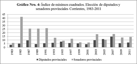 Finalmente, el Gráfico Nro. 4 muestra el índice de mínimos cuadrados en la elección de diputados y senadores. Este índice mide la distancia que existe entre los votos que logran los partidos y los cargos que finalmente obtienen. El resultado de las elecciones es más proporcional mientras más se acerque a 0 (cero) el valor arrojado por la fórmula, lo que significa que el número de escaños que obtiene cada partido es acorde a la cantidad de votos que logra. En contraste, el sistema electoral tiende a ser menos proporcional, y por ende más mayoritario, a medida que el valor se aleja de 0 (cero). El gráfico muestra que cuando se utilizaba el sistema de secciones para designar senadores (1983-1991), el reparto de cargos tendía a ser fuertemente desproporcional; la única excepción a ello fueron los comicios de 1983. El índice cayó significativamente cuando se eliminaron las secciones en 1993.
