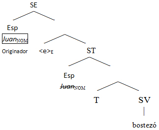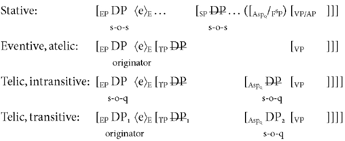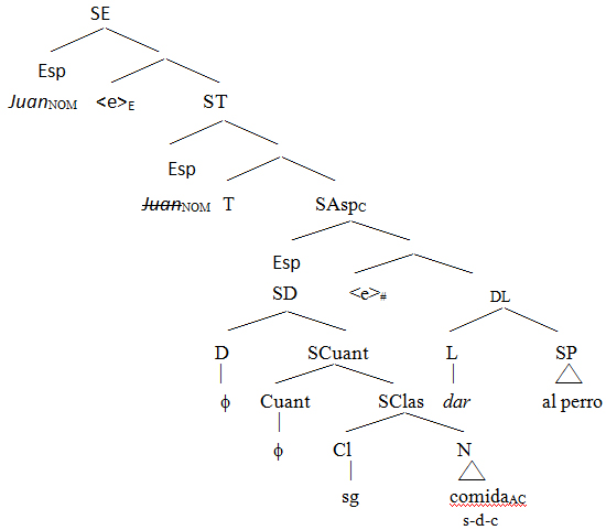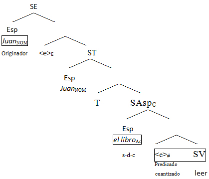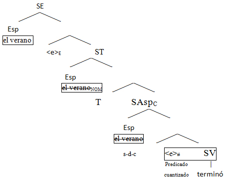 ¿Cuáles son estas proyecciones? Según Borer, en el dominio de los eventos, se pueden distinguir los atélicos12 de los télicos: los primeros son homogéneos y los segundos, no-homogéneos ya que el evento se puede dividir en segmentos que pueden cuantificarse. En este sentido, cuando el evento es télico, se requiere una frase funcional aspectual (Sintagma AspCantidad, AspQuantityP), la primera de las capas funcionales, cuyo núcleo es una variable de tipo cuantificado13. Siguiendo a Verkuyl, la autora considera que la interpretación télica solo puede emerger cuando el núcleo del sintagma aspectual interpreta como sujeto de cambio cuantificable (subject of quantity) al SD que aparece en el especificador del sintagma de Aspecto, que en esta proyección recibe caso acusativo. En segundo lugar, como los eventos están anclados temporalmente, es necesario que haya un sintagma de Tiempo (ST), cuyo núcleo es una variable que debe clausurarse para poder ser interpretada (Cfr. Cano Cambronero, 2014: 13). En tercer lugar, la estructura eventiva (SE) liga existencialmente a la variable eventiva y da cuenta de las propiedades referenciales del evento (Pérez Giménez y Moreno Quibén, 2005: 3).