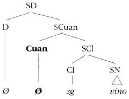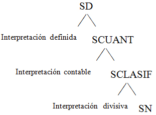 No hay nombres marcados léxicamente como contables o de masa, sino que la interpretación se determina a partir de la presencia o ausencia del Sintagma Clasificador, cuyo rasgo abstracto <div> da lugar a que el nombre se interprete como plural puesto que lo que hace es dividir en porciones una masa (la interpretación por defecto en ausencia de este rasgo). Para que se interprete como contable, el N entra en contacto con el Sintagma Cuantificativo (QuantifierP). Este nivel se define negativamente: un predicado está cuantificado si no es ni acumulativo ni divisivo (vino + vino= vino, una parte de vino= vino, pero ni dos gatos + dos gatos ni una parte de dos gatos dos gatos). En conclusión, que un nombre se interprete como determinado, contable o de masa, depende de la estructura y no del ítem léxico.