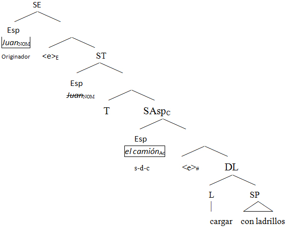 ¿Cuál sería la estructura de oraciones con verbos tradicionalmente considerados ditransitivos? En todas las lenguas, las posiciones de caso disponibles para licenciar argumentos son solo dos. Si aparece un tercer argumento, solo podrá ser interpretado si lo rige una preposición. Así explica Borer las alternancias verbales del tipo cargó ladrillos en el camión/ cargó el camión con ladrillos. En estos casos, en los que hay un argumento que va a ocupar la posición de originador y otro, la de sujeto de cambio, el tercer argumento se va a unir a una Prep que lo va a legitimar. A su vez, el SP se une al SV en el Dominio Léxico, como por ejemplo lo hacen los objetos indirectos, que nunca van a inducir una lectura télica pues se encuentran fuera del dominio del evento.