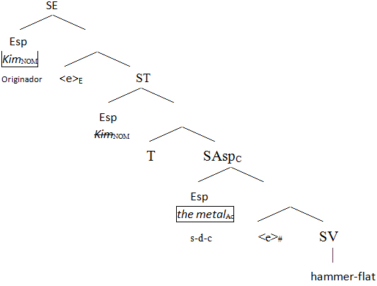 (21) a. Ǝe [quantity (e) & originator (Kim, e) & subject-of-quantity (the metal, e) & (hammer-flat, e)]” (2005: 227)