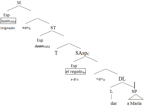 Como habíamos anticipado, a partir de este modelo, nos intentaremos explicar diferentes estructuras en las que participa el verbo dar, sin tener que recurrir ni a diferentes acepciones ni a la noción de verbo liviano. Por ejemplo, una estructura transitiva télica con el verbo dar, que se considera ditransitivo, sería la siguiente: