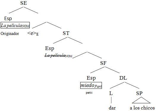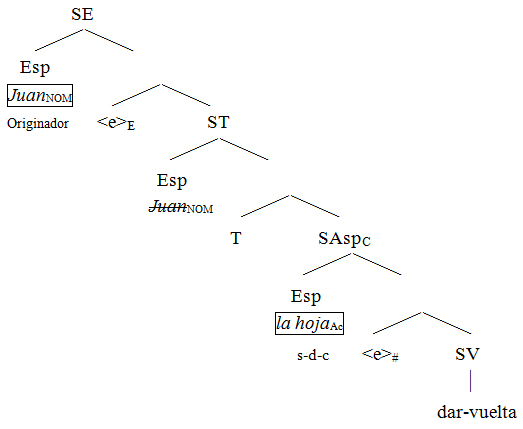 Por ejemplo, un predicado inacusativo (estructura télica intransitiva) tendría la siguiente estructura: