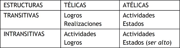 - Estructuras atélicas transitivas e intransitivas: son las actividades y los estados para Vendler- (camina/ está enfermo)
