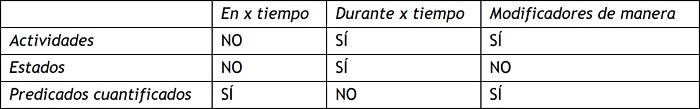 De todas ellas, ¿cuál sería para la autora la estructura más básica? Borer considera que el Sintagma de Evento (Event Phrase) se interpreta por defecto como un proceso no cuantificado, es decir como una actividad, a menos que se especifique lo contrario (ib.id. 83). Por un lado, las actividades no tienen una estructura gramatical específica, que sí tienen los eventos télicos (como se verá más adelante, el Sintagma de AspQ). Por otra parte, las actividades y los predicados cuantificados, en la medida en que son no-estativos, pueden ser modificados por adverbios de manera; pero los estados, no (ver cuadro 1). Entonces, tanto los estados como los eventos télicos tienen una realidad gramatical propia que las actividades no poseen, de allí que Borer las considere el evento por defecto: “Atelic eventive, then, would be the default interpretation in the absence of either quantity structure or stative structure10 (82)”.