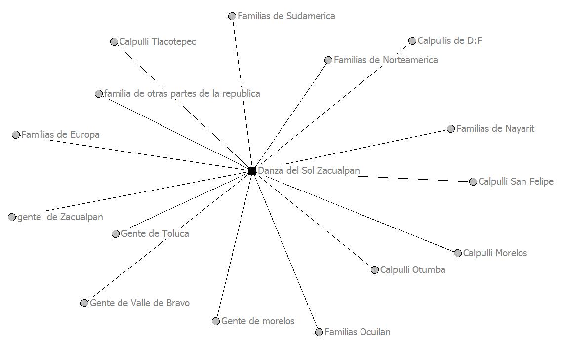 La centralidad nodal de la Danza del Sol que se celebra en Zacualpan, Estado de México, es muy importante, porque muestra un camino para el estudio de este fenómeno: el punto de partida no es necesariamente un grupo social (definido de ese modo apriorísticamente), sino una actividad que se revela como detonante de un ente dinámico, no definitivo que incluye a participantes de otros círculos de “medicina” de México, Latinoamérica y Europa, que eventualmente son observables interactuando en la Danza del Sol, donde las relaciones incluyen elementos no-humanos. En esta red, que por supuesto es más amplia, de lo que muestra el grafo, es el campo de acción y espacio de movimiento, tanto simbólico como geográfico, que vuelve observable al “Camino Rojo” (Zepeda, 2013)