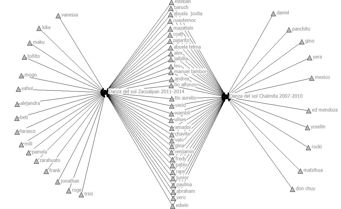 Un acercamiento mayor a lo que representa el Diagrama 1 revela conexiones al interior del ritual-nodo; es decir, conexiones entre individuos a propósito de su encuentro en el ritual. Se decidió ver conexiones, como datos reticulares, y no pensar a priori en grupo social porque la contingencia de esta reasociación de actores fue evidente en todo el trabajo de investigación. De los actores que aparecen en el Diagrama 2 se identificaron participantes en común entre la Danza de Chalmita y la de Zacualpan; pero en el periodo 2007-2010 la primera se encontraba integrada por 41 personas, de las cuales sólo 31 actualmente se mantienen vigentes (centro de la red);23 y para la Danza del Sol en Zacualpan se integraron 16 danzantes de nuevo ingreso para el ciclo 2011-2014, sumando 47 danzantes en total (Trabajo de campo, Zacualpan, 2012)