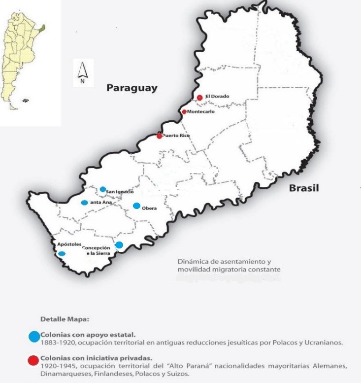 El poblamiento de Misiones fue impulsado, de este modo, por los mecanismos estatales en un primer momento. Si bien las primeras colonias se formaron en el sur del Territorio Nacional -entre ellas Santa Ana y Candelaria mensuradas en 1883 por Rafael Hernández-, la colonización oficial cobró más fuerza con la refundación de antiguas colonias jesuíticas como la de Apóstoles en 1897, que recibió inmigrantes de origen polacos galitzianos a partir de las promociones realizadas por el entonces Gobernador del Territorio Nacional, Juan José Lanusse.