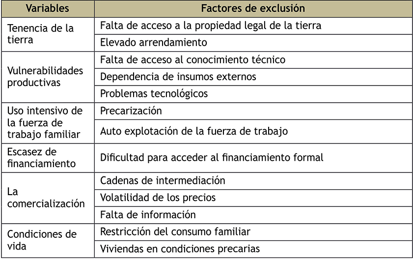 Cada una de las seis variables del cuadro n°1 a su vez se compone de factores de exclusión que son los que constituyen las diferentes desventajas o asimetrías que afectan a los agricultores familiares. Asimismo, y retomando los aportes de Subirats et al (2004), los diversos ejes presentados se ven reforzados por otros factores de desigualdad que atraviesan transversalmente a las variables de exclusión. Se mencionarán brevemente algunos para enmarcar el análisis posterior de cada una de las variables.