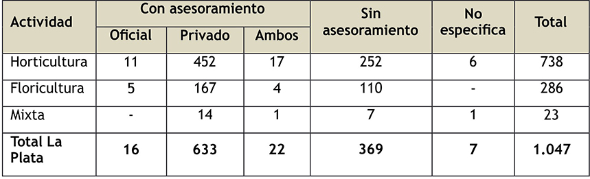 Este cambio volvió a las producciones familiares cada vez más dependientes de los insumos externos: los conocimientos específicos y los saberes técnicos se tornan un insumo más con la tecnología del invernáculo (García & Kebat 2008; García 2015) . Sin embargo, la mayoría de los productores de la región, o no cuentan con asesoramiento, o los que la reciben recurren a las agronomías privadas de la zona (Blandi et al. 2015; Cieza 2004) . En el cuadro n° 2 se brinda información que da cuenta de esta necesidad, en las Explotaciones Hortiflorícolas (EHF).