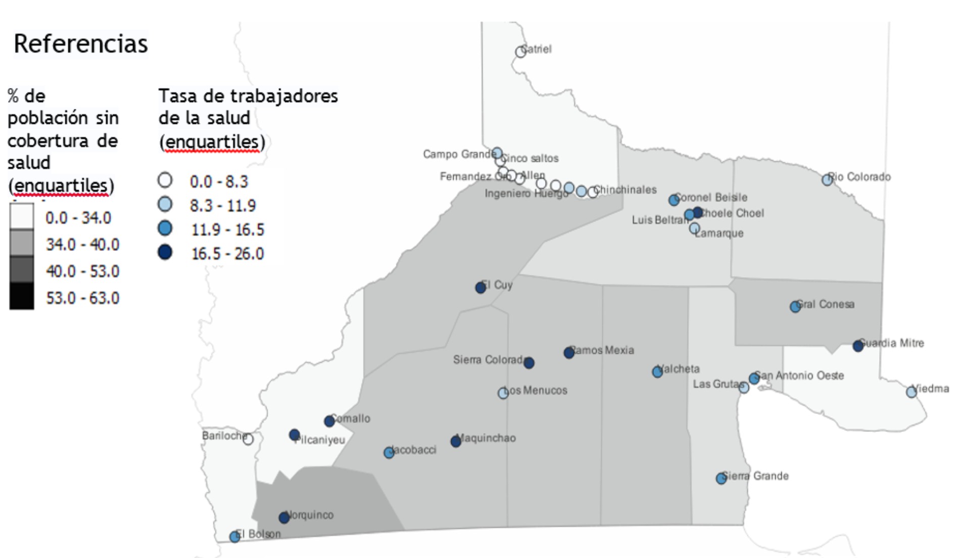 En este marco, la distribución de recursos humanos y también la cantidad de establecimientos de salud en cada una de las localidades de la provincia resulta muy dispar. Se puede observar en el mapa que las tasas más elevadas de profesionales por habitantes se encuentran ubicadas en la zona central de la provincia, reconocida como la zona de estepa, la línea sur, donde vive menos del 20% de la población de la provincia, pero donde más del 40% de esta población no tiene obra social ni prepaga. En cambio, en dos de los tres departamentos con menor porcentaje de población sin cobertura (al oeste y norte provincial) se observan los menores valores de trabajadores/as del sistema público de salud, salvo en el departamento donde se encuentra ubicada la capital provincial (al este de la provincia) donde existen de los menores valores de población sin cobertura, pero valores intermedios de trabajadores de la salud (Mapa 1).