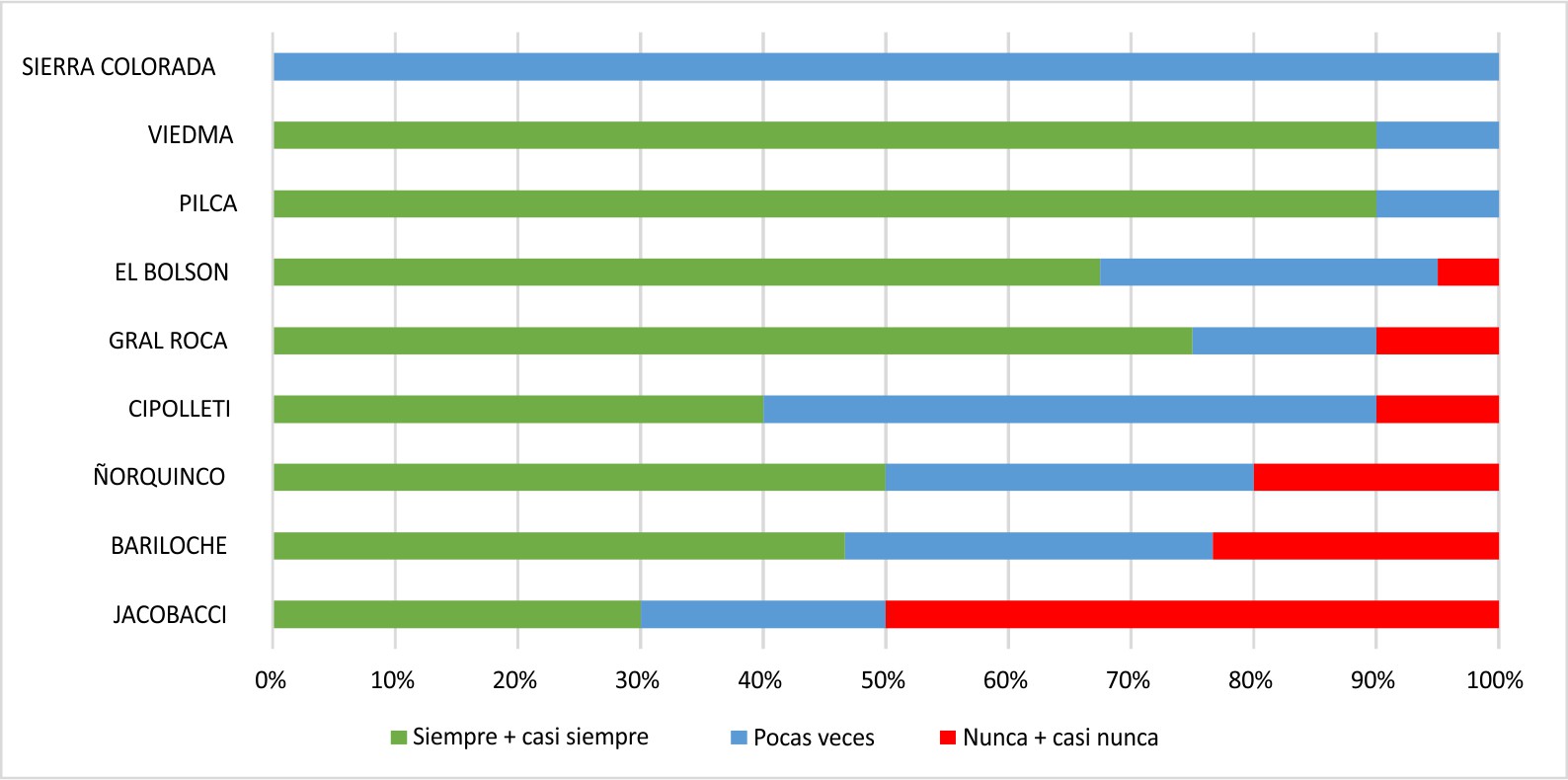En la misma línea, los resultados arrojados por la encuesta realizada en los centros de salud de diferentes localidades de la provincia se corresponden con los discursos de los y las trabajadores/as de los equipos de salud al tiempo que visibilizan una distribución de insumos muy desigual y arriesgaríamos arbitraria, ya que no existen razones explícitas que expliquen los modos en que se distribuyen/asignan estos insumos. En este contexto, la frecuencia de recepción de medicamentos para enfermedades respiratorias, diabetes, hipertensión, antiinflamatorios, antibióticos, antiparasitarios, antiepilépticos, antimicóticos, preservativos y anticonceptivos requeridos por diferentes grupos osciló entre centros de salud en los cuales los medicamentos llegaron en el año 2016 más del 90% de las veces siempre o casi siempre (como Viedma o Pilcaniyeu) y otros como Ing. Jacobacci, en los que un 50% de las veces nunca o casi nunca los recibieron (Figura 1).