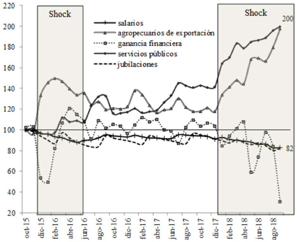 Como lo expresa el gráfico, la estrategia inicial (shock 2016, relajamiento gradualista en 2017) se vio crecientemente modificada en 2018, cuando Macri se proponía consolidar el giro ortodoxo21, lo que desató un nuevo dique de resistencia social. A partir de entonces, la crisis económica, explicada por el creciente endeudamiento externo y la exacerbación de la valorización financiera, hicieron ingresar al proyecto político neoliberal en nuevas tensiones de incierto desenlace. Ello se observa en la modificación en las relaciones de precios relativos bajo el segundo shock, cuando la ganancia financiera se fue deteriorando y descollaron las tarifas de los servicios públicos y los precios de los productos agropecuarios. Al mismo tiempo, los salarios y las jubilaciones ingresaron en un nuevo y más profundo declive, que anticipa un deterioro mayor a medida que se traslade a precios la devaluación. Es decir, se mantiene el objetivo “inicial” neoliberal, solo que después del ensayo gradualista, se aceleran los tiempos de ejecución y se pone en tensión la viabilidad política del mismo.