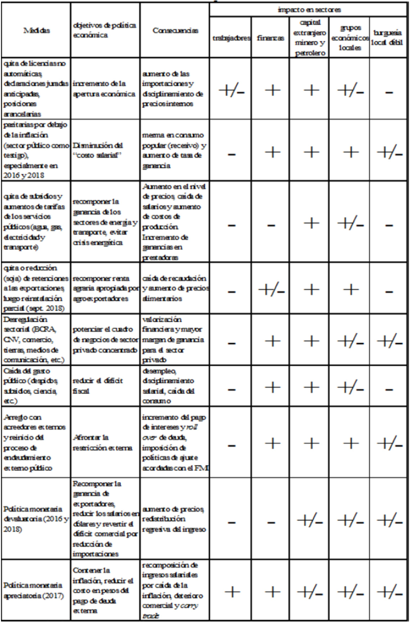 La emergencia de Cambiemos expresa la representación política de un nuevo bloque en el poder, con un proyecto definido: por encima del objetivo del crecimiento y la estabilización económica, se priorizó la redistribución del ingreso desde las clases subalternas a sectores específicos de las clases dominantes. Dentro de este conjunto de sectores del capital lanzados a liderar esta etapa, vale distinguir a quienes se han posicionado como los hegemónicos: el capital extranjero y el sector financiero (con concesiones, no sin tensiones, hacia el sector agrario). En cambio, las fracciones de la gran burguesía local, especialmente la industrial, así como los sectores de servicios vinculados (inmobiliarios, comercio minorista) aparecen relegados y concurren en forma subordinada al bloque en el poder: beneficiados por un nuevo orden distributivo regresivo pueden mejorar su tasa de ganancia, pero no prevalece el discurso desarrollista (y por ende, industrialista) de los tiempos kirchneristas.