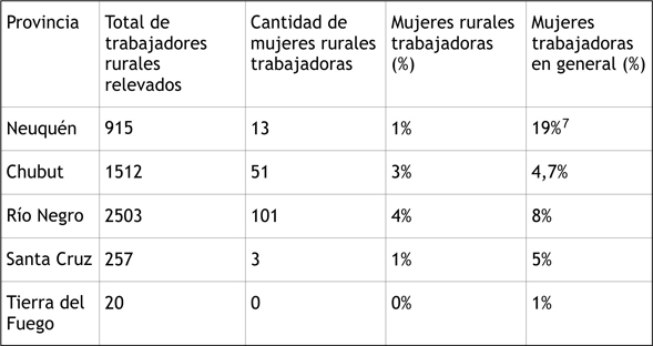 Estos resultados se enmarcan en los nacionales, donde la población femenina ligada al trabajo rural fue del 7%, mientras que el porcentaje de mujeres trabajadoras en general fue del 14%. En el caso patagónico solo se destaca el caso de Neuquén. Estos guarismos merecen dos observaciones, por una parte son notablemente menores a los del censo previo de 1895, que había registrado para el país un 30% de mujeres trabajadoras con un 17% de trabajadoras rurales. Por otra, dada la relevancia del trabajo rural en un territorio que se organizaba como agroganadero, es notable la decisión de omitir las tareas femeninas asociadas a estas prácticas.