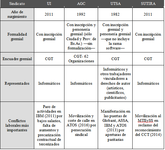A continuación, presentamos un cuadro que resume los principales rasgos de los sindicatos informáticos que se encuentran actualmente en funcionamiento en Argentina: