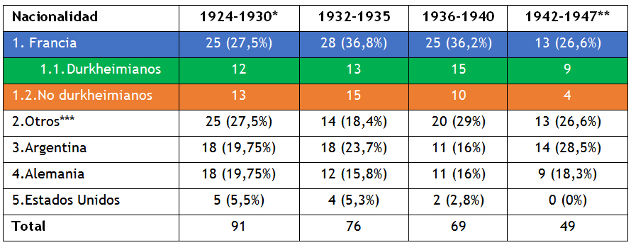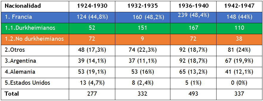 En el Cuadro 2 el peso de los sociólogos franceses se eleva de manera sensible, aventajando de forma ostensible a las otras nacionalidades. En rigor, prácticamente la mitad de los textos propuestos en los programas de Levene pertenecían a autores nacidos en Francia y, entre ellos, la mayoría eran de miembros de la Escuela de Durkheim. Tal como puede apreciarse en el desglose entre “durkheimianos” y “no durkheimianos”, luego del retorno de Levene a la cátedra de sociología en 1932 los primeros nunca fueron menos de dos tercios de las referencias francesas (42% entre 1924-1930; 94,3% entre 1932-1935; 69,9% entre 1936-1940; 74,3% entre 1942-1947). Trasladado al conjunto de la materia, puede afirmarse que desde la década de 1930 los “durkheimianos” constituyeron un tercio de la asignatura, llevándose los siguientes porcentajes de las referencias: 18,7% entre 1924-1930; 45,5% entre 1932-1935; 33,9% entre 1936-1940; y 32,6% entre 1942-1947.