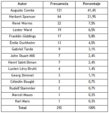 En el Cuadro 3 es palpable el peso del positivismo de mediados del siglo XIX, ya que prácticamente dos tercios de las entradas corresponden a Comte y Spencer.6 Entre los positivistas franceses posteriores a Comte, Durkheim y Tarde, de quienes se recupera su famoso debate, son los mejor ponderados. Por el contrario, autores ajenos a esta tradición, como los alemanes Simmel o Stammler, apenas tienen un par de menciones. Finalmente, entre los sociólogos estadounidenses Ward y Giddings son los únicos mencionados, dejando de lado a Albion Small y Charles Ellwood, quienes también formaban parte de las lecturas locales de la sociología norteamericana.