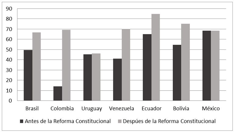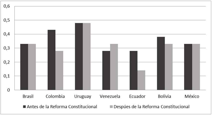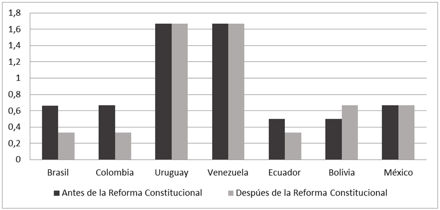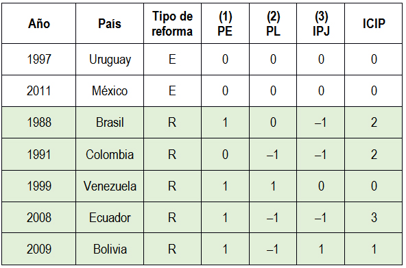Si consideramos la dimensión técnica, observamos que: I) en los casos de remplazo constitucional, en la mayoría (Brasil, Colombia, Ecuador, Bolivia) operó un aumento del ICIP, en diferente medida, con la excepción de Venezuela; II) en los casos de enmienda constitucional (Uruguay, México) no se observa aumento del ICIP. De manera que ambos grupos de países muestran homogeneidad, con una excepción en el primer grupo (Venezuela).