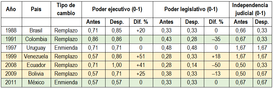 Si abordamos esos datos desde la dimensión técnica, observamos que: I) en casi todos los casos donde hubo remplazo constitucional aumentó significativamente el IPPE (Brasil, Venezuela, Ecuador y Bolivia), con la excepción de Colombia. Por su parte, el IPPL aumentó únicamente en Venezuela, disminuyó en Colombia, Ecuador y Bolivia y se mantuvo incambiado en Brasil. A su vez, el IIPJ aumentó únicamente en Bolivia, se mantuvo incambiado en Venezuela y disminuyó en Brasil y Ecuador; II) en los casos donde hubo enmienda constitucional el IPPE no registró aumento (México, Uruguay), el IPPL se mantuvo incambiado (Uruguay, México) y el IIPJ se mantuvo incambiado (Uruguay y México).