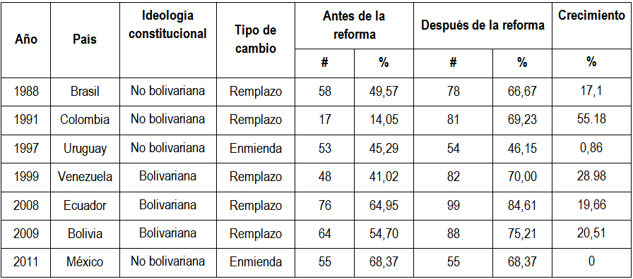 La tesis también se corrobora plenamente en los casos de cambios constitucionales por remplazo (bloque bolivariano más Brasil y Colombia), mientras que en los casos de enmienda, no aumenta el número de derechos o el aumento es insignificante.