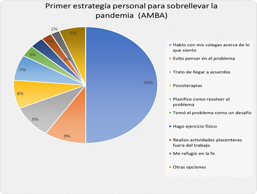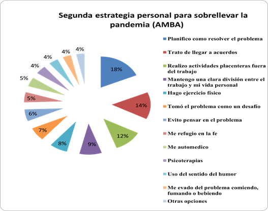 En cuanto a las estrategias personales para sobrellevar la pandemia (Gráfico 3) un 50 % de las respuestas favorables se inclinaron por la de “Hablar con mis colegas acerca de lo que siento”. Por encima de los conflictos y la sobreexplotación laboral, los y las entrevistados/as destacan los fuertes lazos colectivos construidos por sus pares y la capacidad de adaptación en un contexto de múltiples falencias e incertidumbre, distinguido en otras investigaciones. La segunda (gráfico 4) “planifico cómo resolver el problema” fue la opción más frecuente con un 18%, por lo que demarca las formas de resolución entre pares, vistos como quienes suelen comprender mejor las situaciones que se viven dentro del sistema de salud.