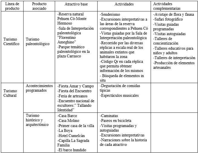 La tabla 3 muestra propuestas de diversificación considerando productos relacionados al turismo paleontológico y cultural.
