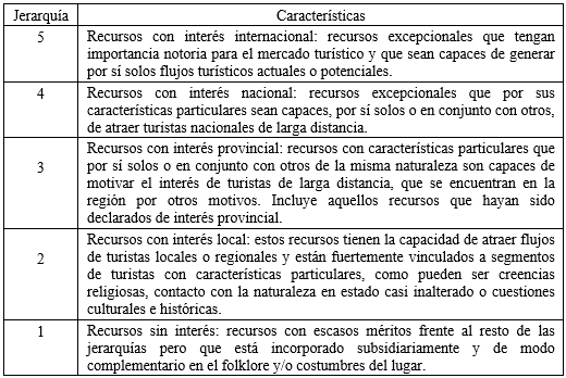 La jerarquización de los recursos turísticos es una etapa importante en los procesos de planificación. En la presente investigación se utilizará la clasificación propuesta por el Centro Interamericano de Capacitación Turística de la Organización de Estados Americanos (CICATUR-OEA) que plantea realizar un inventario de recursos clasificándolos según categorías y tipos y valorarlos del 1 al 5 por su singularidad en términos geográficos, correspondiéndole a la mayor jerarquía el puntaje 5 (Tabla 1).