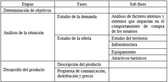 Machado y Hernández (2007) aseveran que el diseño y creación de productos turísticos consiste en un trabajo que conlleva la búsqueda de beneficios económicos, sociales y medioambientales, por lo que los procedimientos son variados y cuentan con diversas etapas, elementos, factores y objetivos; esto debido a los diferentes contextos que tienen las personas, instituciones u organizaciones que los crearon. Muchos autores han trabajado en la elaboración de métodos para la creación de productos turísticos (Machado y Hernández 2007, García y Quintero 2018 y Cardet et al 2018), en forma general, la mayoría coinciden en que el método a aplicar debe contemplar las etapas enumeradas en la tabla 2.
