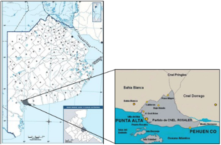 Pehuen Có se ubica en los 38° 59’ 51’’ de latitud Sur y 61° 36’ 16’’de longitud Oeste, en la costa atlántica al sudoeste de la provincia de Buenos Aires, a 650 km de la Capital Federal, a 86 km de Bahía Blanca y a 68 km de Punta Alta, ciudad cabecera del partido del Coronel Rosales (Figura 1).