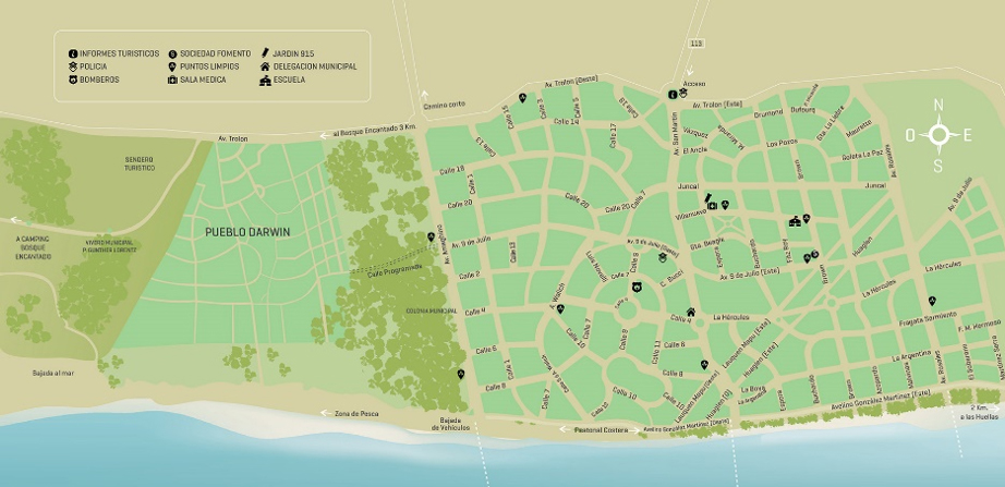 La localidad fundada en 1948, se coloca en un plano irregular, a 15 metros sobre el nivel del mar, posee todas sus calles sin asfaltar y su nombre proviene de la lengua araucana que significa pino y agua. Su desarrollo es paralelo a la costa la cual tiene una orientación Este - Oeste. Las edificaciones más elevadas no superan los tres pisos y las casas tienen jardín o parque a su alrededor. Figura 2.
