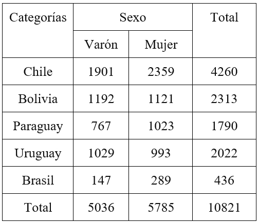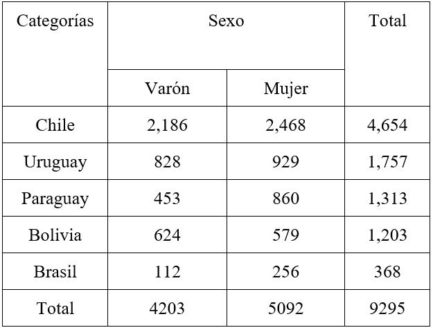En la migración chilena, que como explicamos es la más numerosa en el partido, la diferencia entre varones (1901) y mujeres (2359) es de 458 personas a favor de las mujeres. Ese número, en una cantidad de migrantes que sumado da 4260 es significativa y muestra que la migración chilena hacia General Pueyrredon estaba feminizada para el 2010, tal y como había mostrado también el censo de 2001. Algo similar sucede con la migración paraguaya, que representa una cantidad de 1790 personas, de las cuales 1023 son mujeres y 767 son varones, lo que significa una diferencia de 256 personas a favor de las mujeres. En este caso, se vuelve evidente que la migración de mujeres paraguayas hacia el partido es más significativa que la de varones, algo que también sucede en la provincia en general.