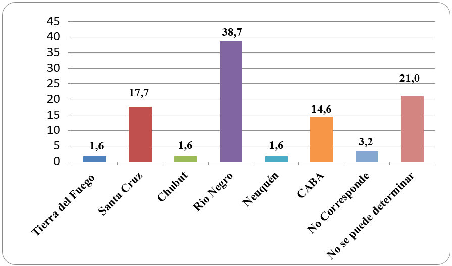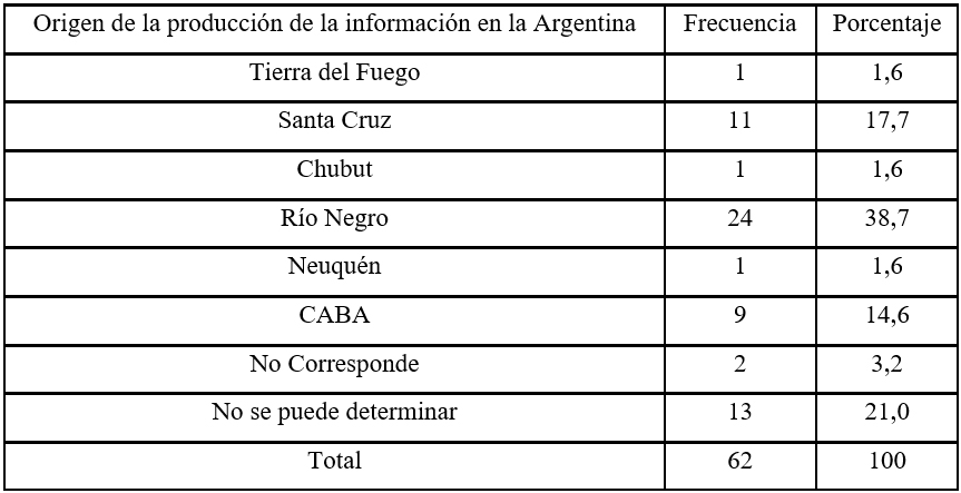 Al analizar la particularidad local del origen de la producción periodística (Tabla 4 y Figura 4) de los 47 ítems informativos paleontológicos producidos en Argentina, se observa que el 38,7% fueron producidos en la provincia de Río Negro, el 17,7% en Santa Cruz, mientras que en el 14,5% de los casos la producción se originó en la Ciudad Autónoma de Buenos Aires, y los tres casos restantes corresponden a las restantes provincias de la región patagónica Argentina, Neuquén, Chubut, y Tierra del Fuego, Antártida e Islas del Atlántico Sur (1,6%). Mientras que el restante 24,2% de la muestra se compone del 21,0% de los casos en los cuales el origen de la producción periodística es extranjero a la Argentina y el 3,2% no se puede identificar su procedencia por no explicitarse en el artículo periodístico.